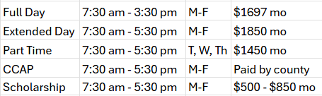 Toddler Program Tuition & Schedule Options